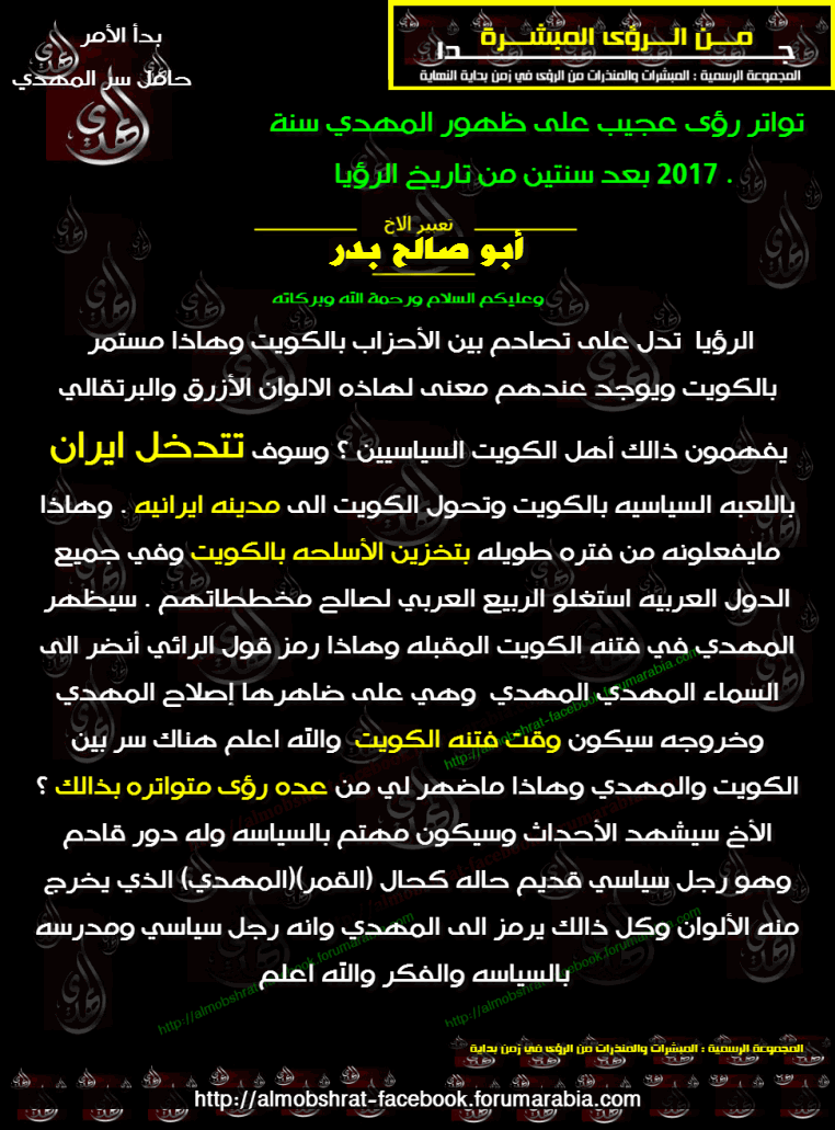 موسوعــــــــة الرؤى في زمن بداية النهاية Http Almobshrat Forumarabia Com تواتر رؤى عجيب على ظهور المهدي سنة 2017 بعد سنتين من تاريخ الرؤيا