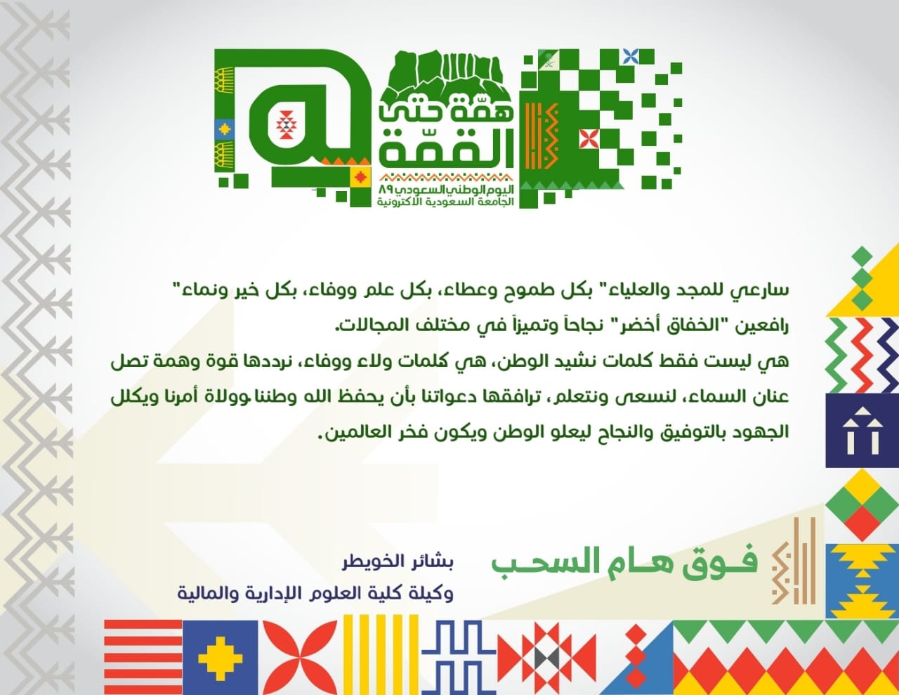 الجامعة السعودية الإلكترونية On Twitter كلمات ومشاعر منسوبي الجامعة بمناسبة اليوم الوطني السعودي ٨٩ اليوم الوطني89 اليوم الوطني السعودي همة حتى القمة همة التعليم قمة للوطن الجامعة الإلكترونية اليوم الوطني٨٩ Https T Co 7gbjqiovuf