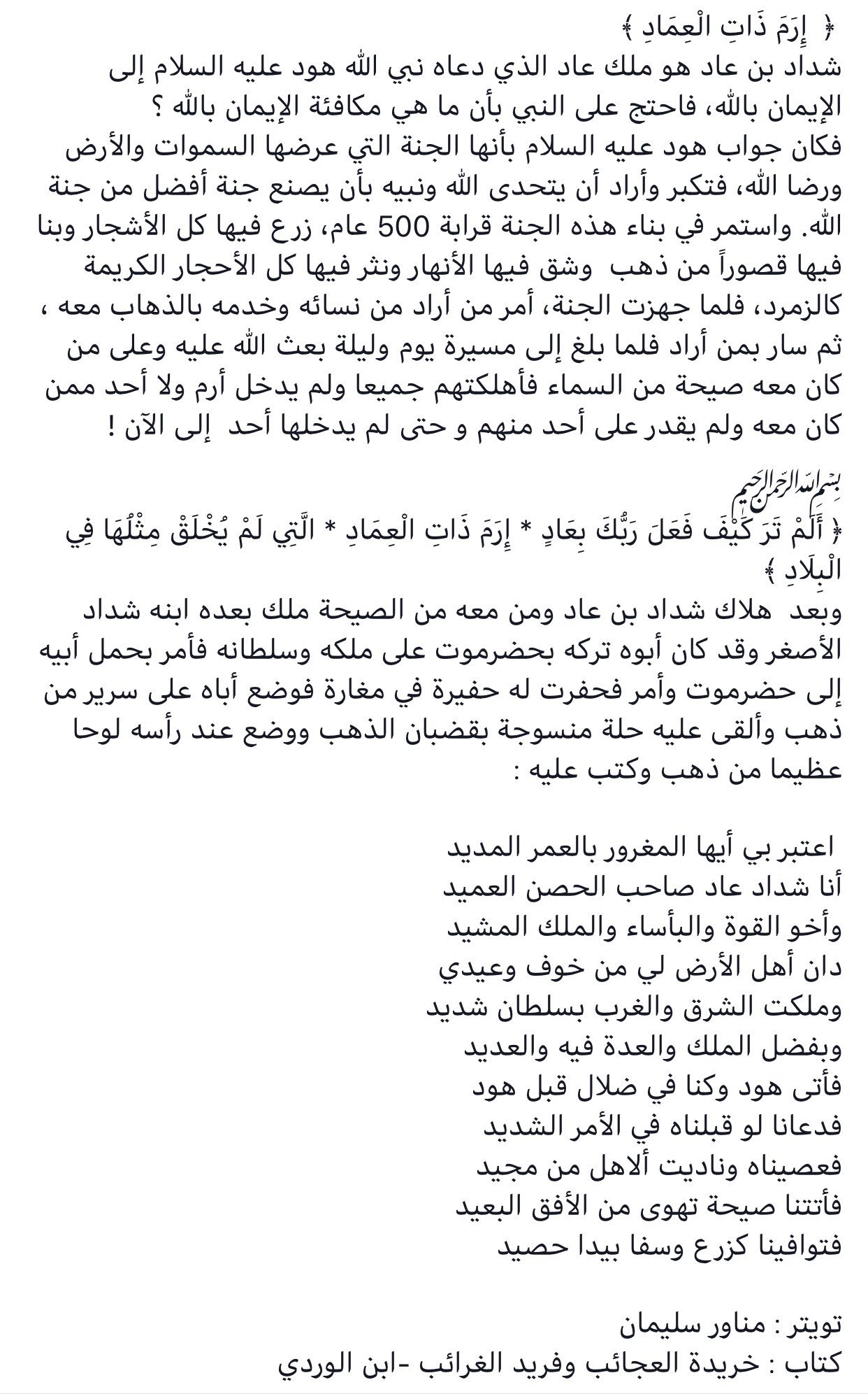 مناور سليمان En Twitter إ رم ذات ال ع ماد قال الشعبي عن علماء حم ير لما هلك شداد بن عاد ومن معه من الصيحة ملك بعده ابنه شداد الأصغر فأمر بحمل